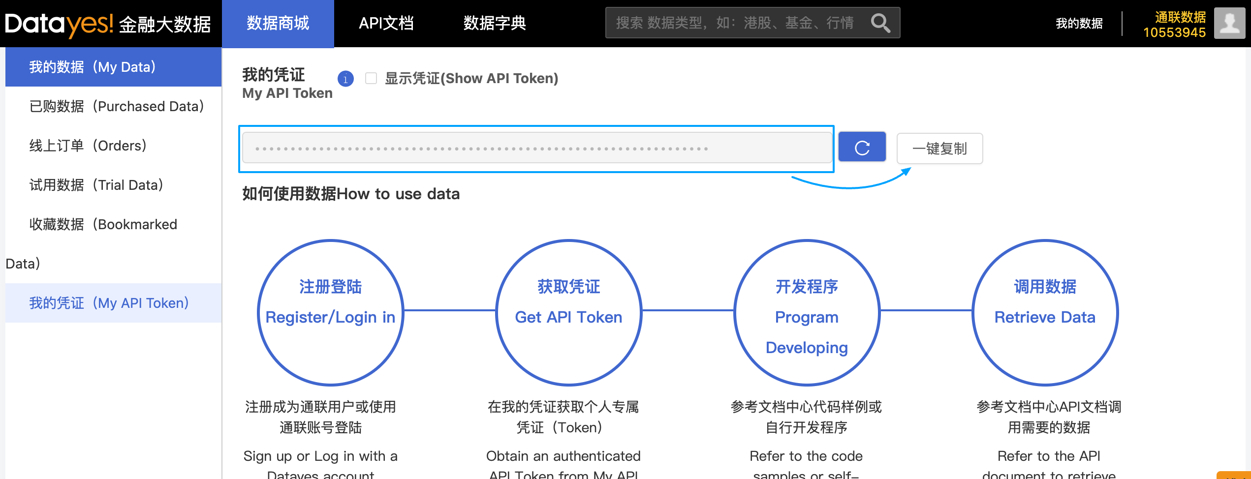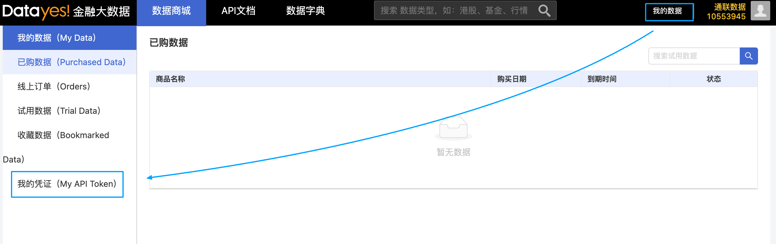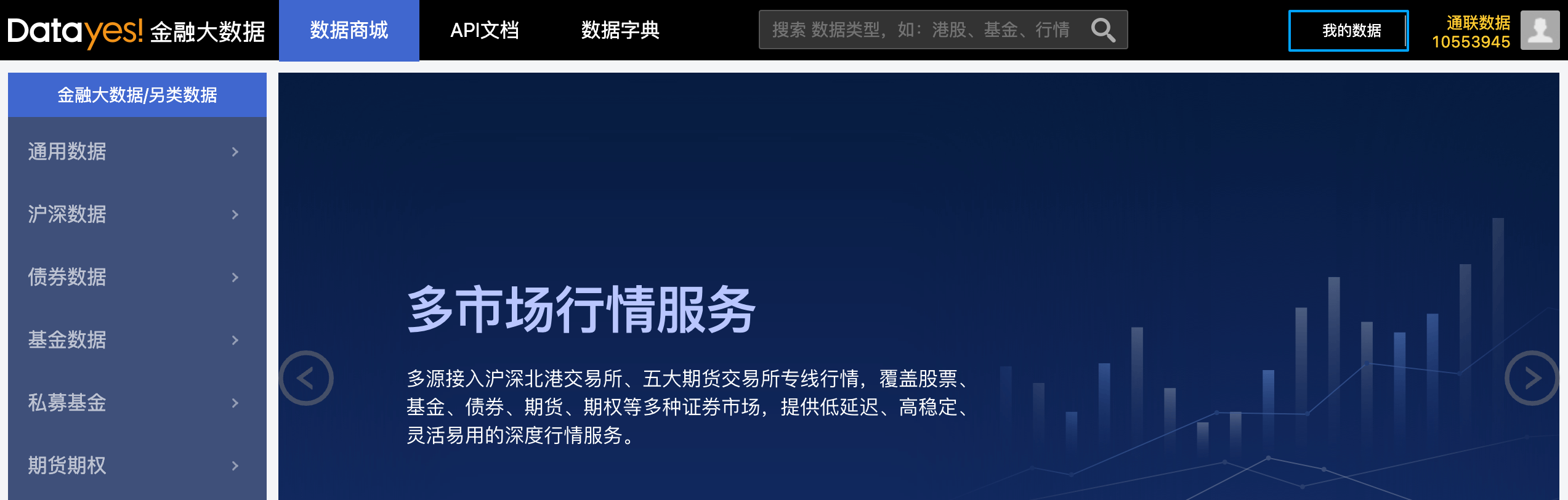 进入Datayes网站,登录账号后,点击右上角我的数据。