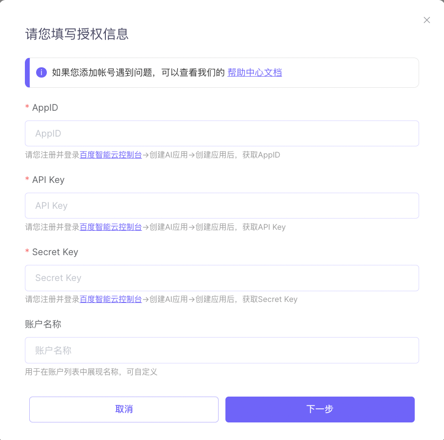 文心一言在集简云授权需要填写【AppID】【API Key】【Secret Key】3项信息,您需要联系百度智能云客服获取。