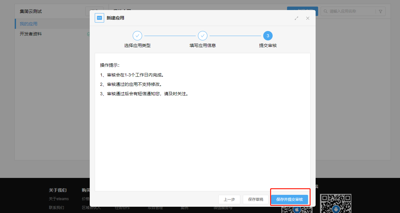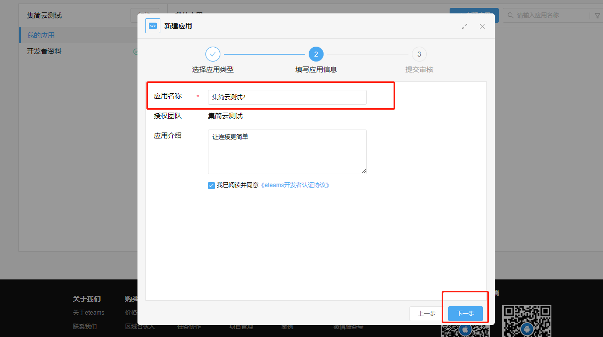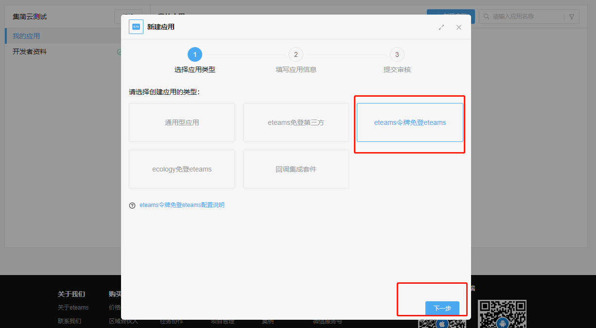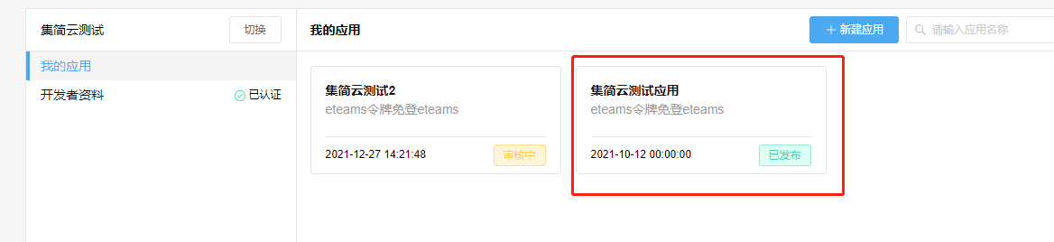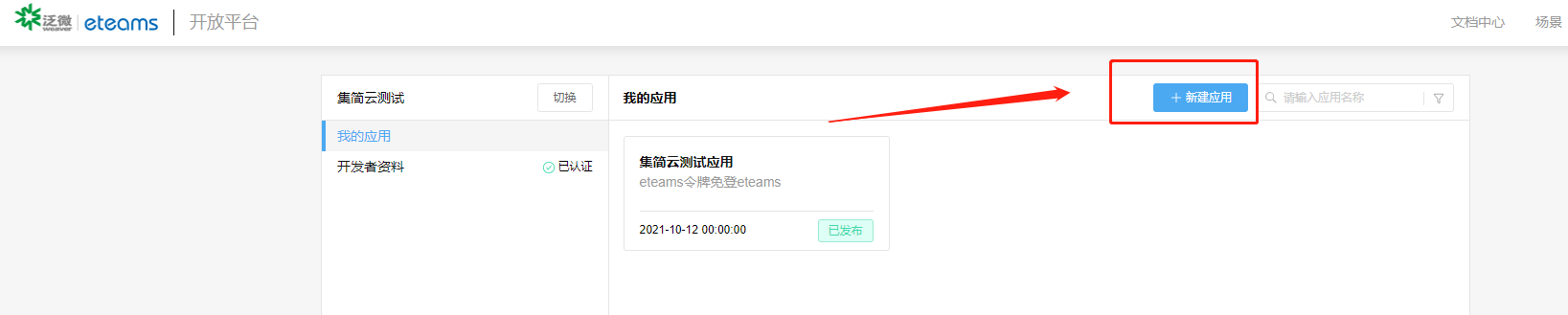 1、登录泛微开发者平台:https://weapp.eteams.cn/sp/openapi/base/app/mine,点击【新建应用】选择【eteams令牌免登eteams】点击【下一步】,填写【应用名称】-【应用介绍】点击下一步,【保存并提交审核】,一般1-3天审核,通过后会有短信通知。