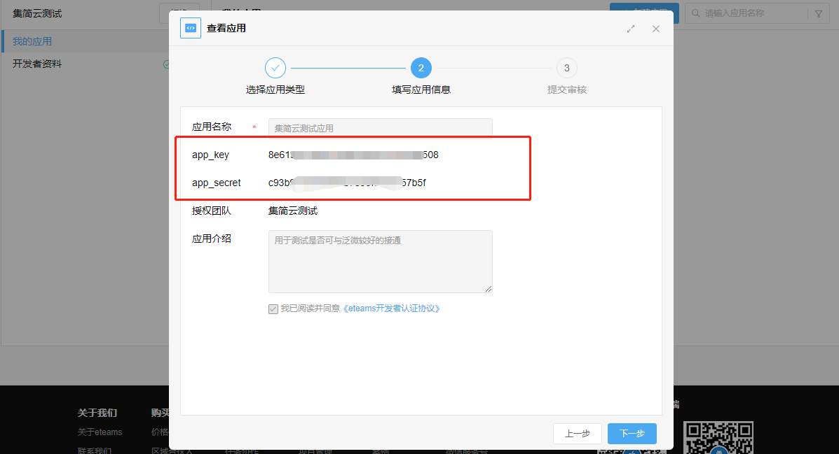 2、审核通过后,点击应用,查看【app_key】和【app_secret】,并复制到集简云的授权窗口。