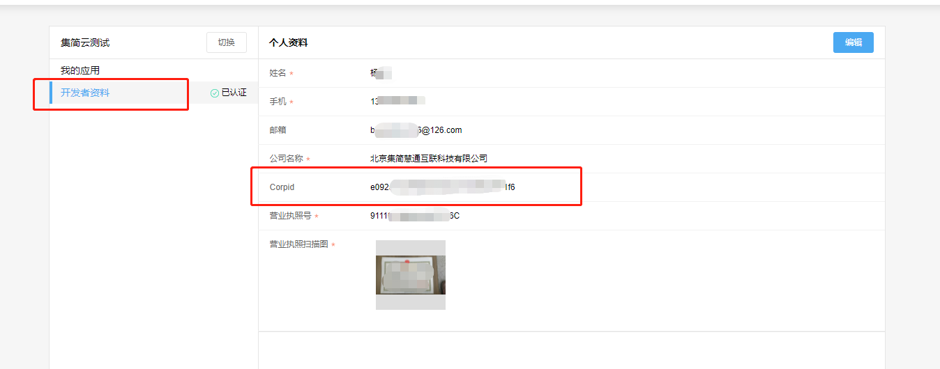 3、登录泛微开发者平台,进行开发者认证后,在【开发者资料】中查看企业ID,如下图红框中的【Corpid】复制到集简云授权页面的【企业ID】文本框内,即可完成授权。