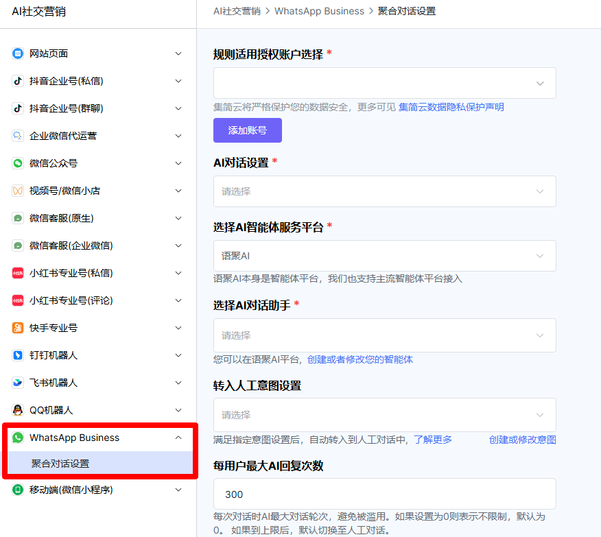 WhatsApp是跨境商务沟通中常用的对话系统,目前已经接入到集简云连接器 和 语聚AI系统中。通过连接器和聚合对话功能可以实现: