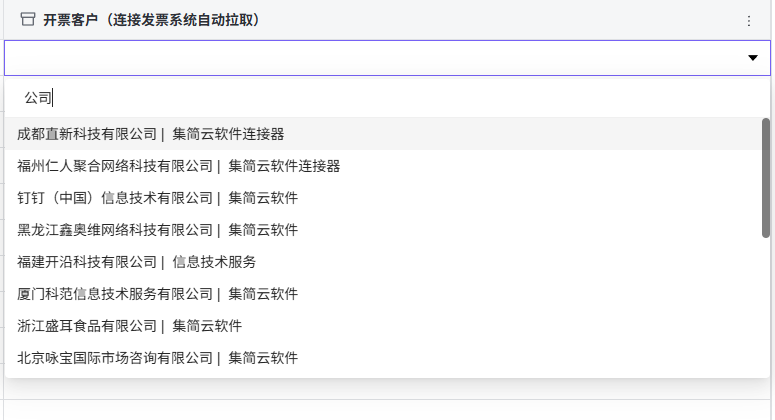 动态下拉字段类型可以查询第三方应用软件中的数据并作为下拉选项使用: