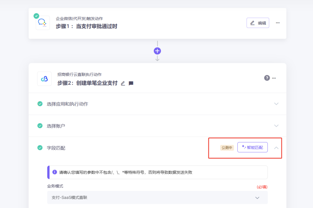 是否在集简云创建流程时,不知道字段直接的匹配应该如何设置?集简云AI字段匹配功能目前全面升级,基于历史数据与AI大模型自训练大幅度提升了AI字段匹配的准确性,并支持了复杂数组结构的分析与匹配。您需点击步骤设置中的“智能匹配”按钮即可轻松完成字段匹配与设置。