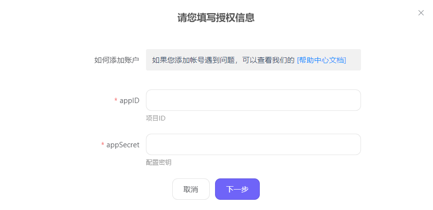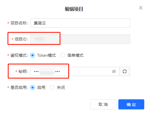 2、将【项目ID】和【秘钥】复制到集简云授权页面,即可完成授权。