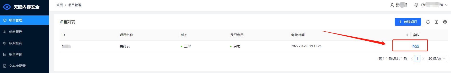 1、登录天眼内容安全,进入【项目管理】-【项目列表】-【配置】,查看【项目ID】和【秘钥】