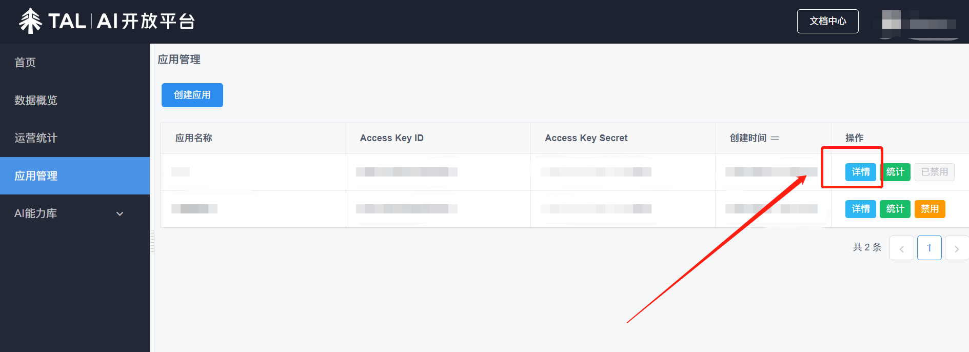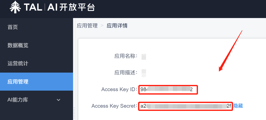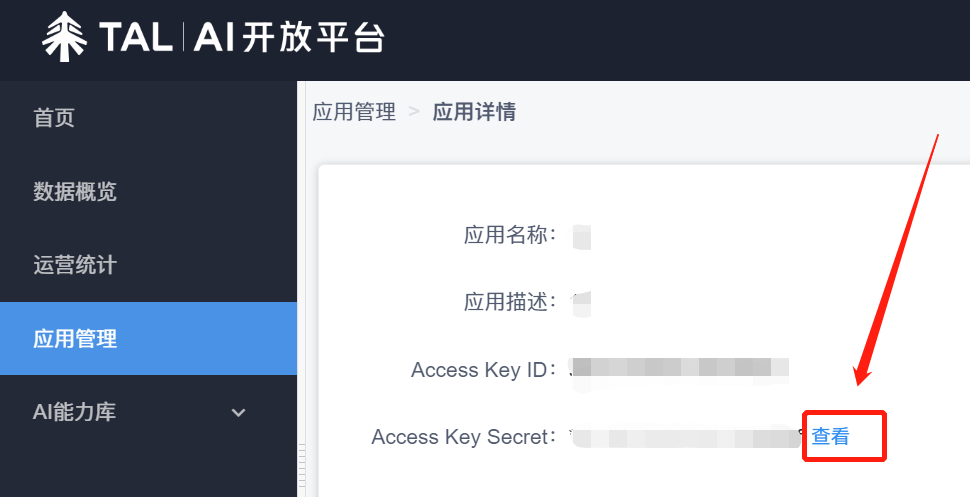 2.进入好未来控制台后,点击左侧菜单栏中的“应用管理”,点击右侧“详情”,进入应用详情页面,点击“查看”
