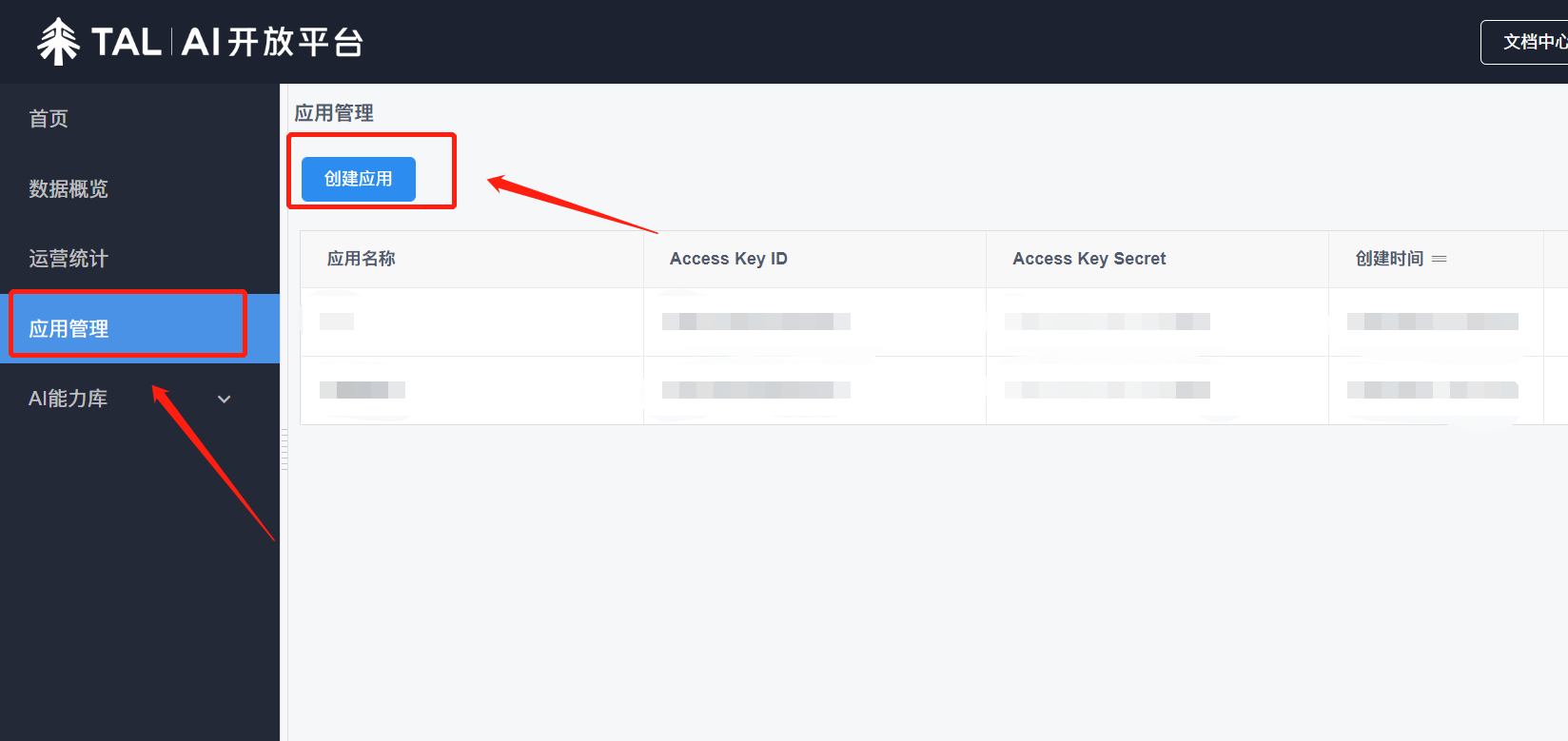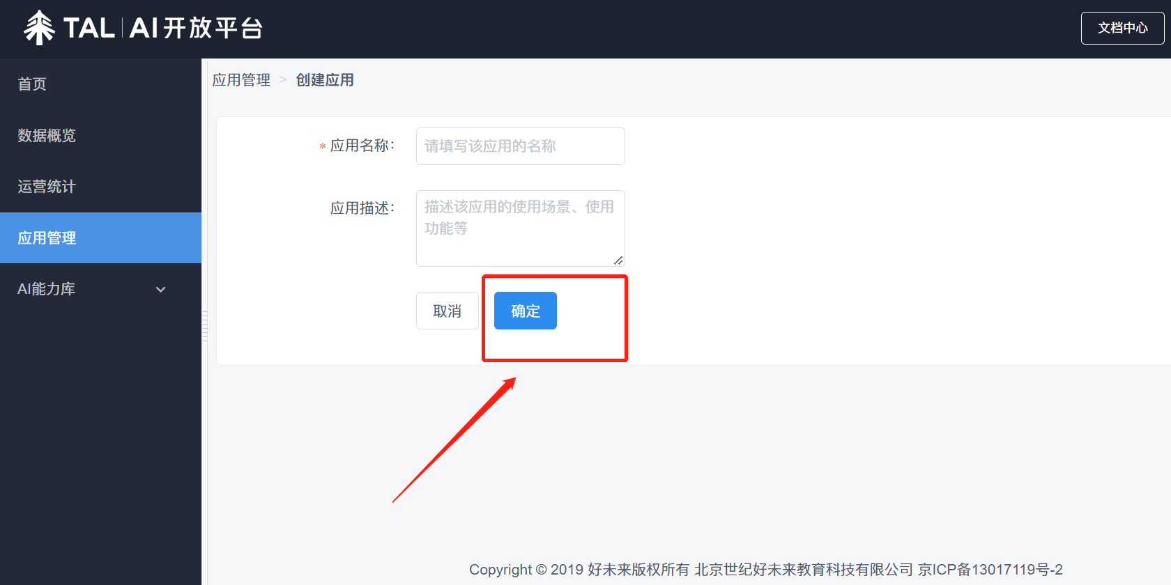 4.如果【应用管理】页面,您还没有创建应用,请点击上方“创建应用”,输入【应用名称】和【应用描述】,点击“确定”