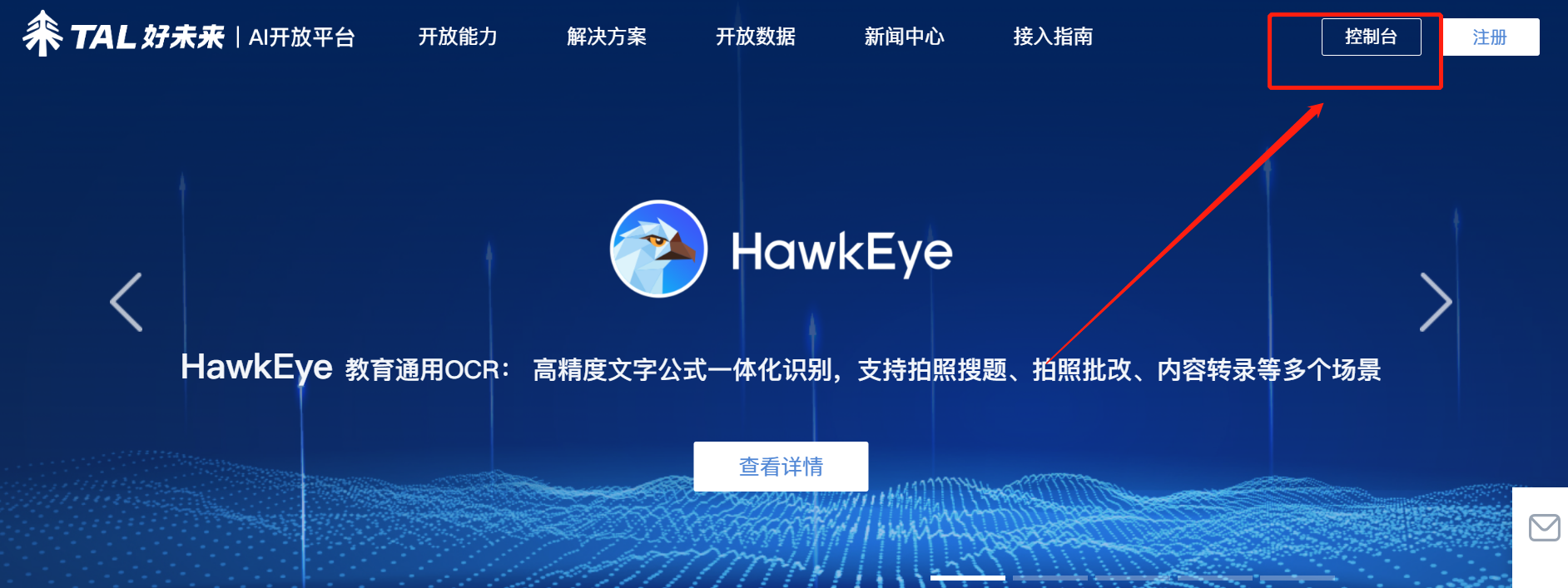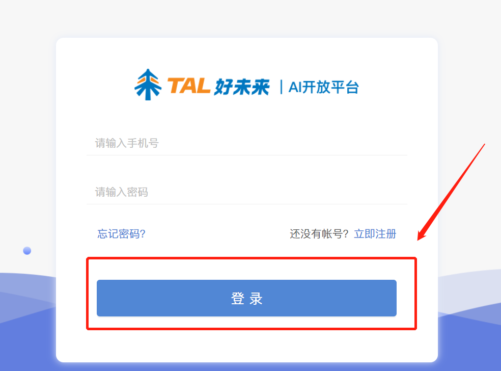 1.首先复制链接https://ai.100tal.com/,进入好未开放平台,点击右上角“控制台”,输入【手机号】和【密码】,点击“登录”