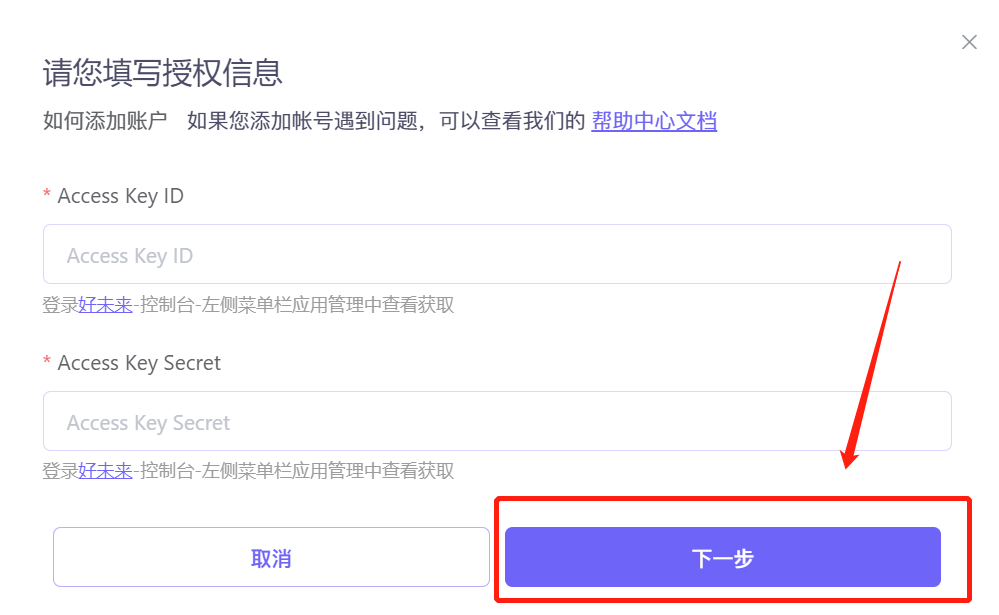 3.页面会显示【Access Key ID】和【Access Key Secret】,将这两个参数复制,粘贴到集简云账号授权界面,点击“下一步”即可授权成功