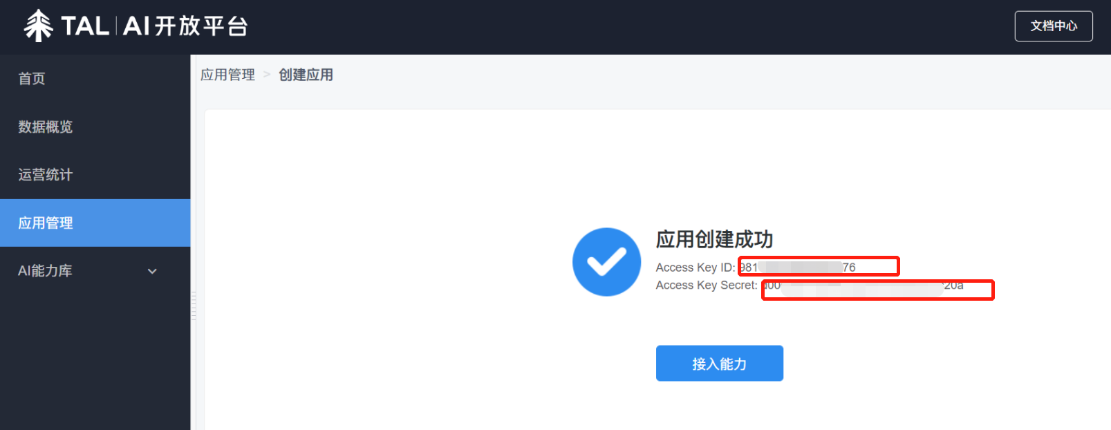 5.页面会显示应用创建成功,将下方的【Access Key ID】和【Access Key Secret】两个参数复制,粘贴到集简云账号授权界面,点击“下一步”也可以授权成功