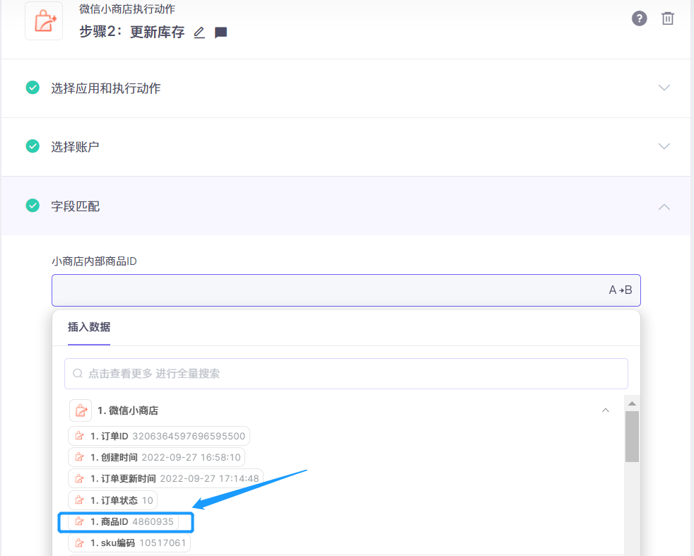 2.执行动作“更新库存”小商店内部商品ID字段选择插入“商品id”即可
