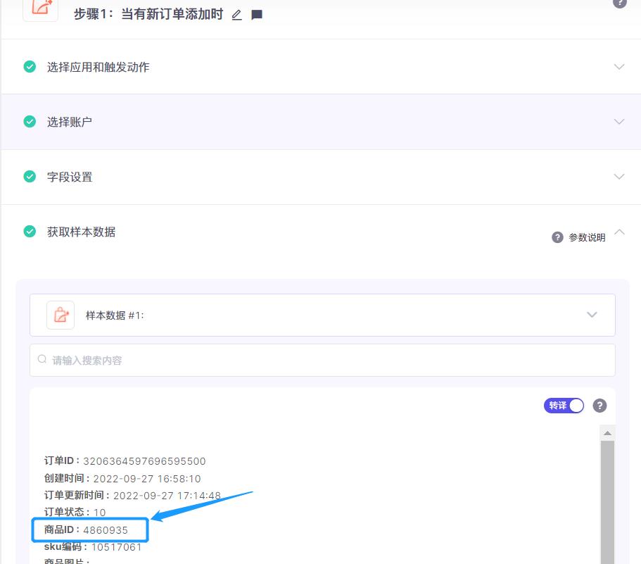 A:1.可从触发动作“当有新订单添加时” 获取商品ID的样本数据
