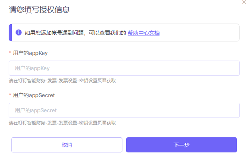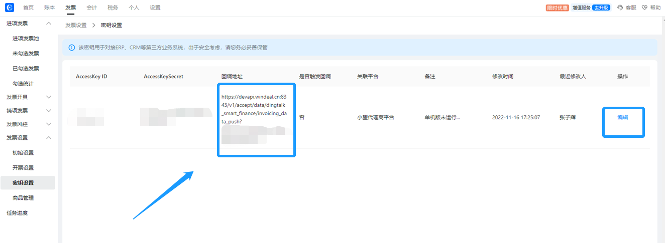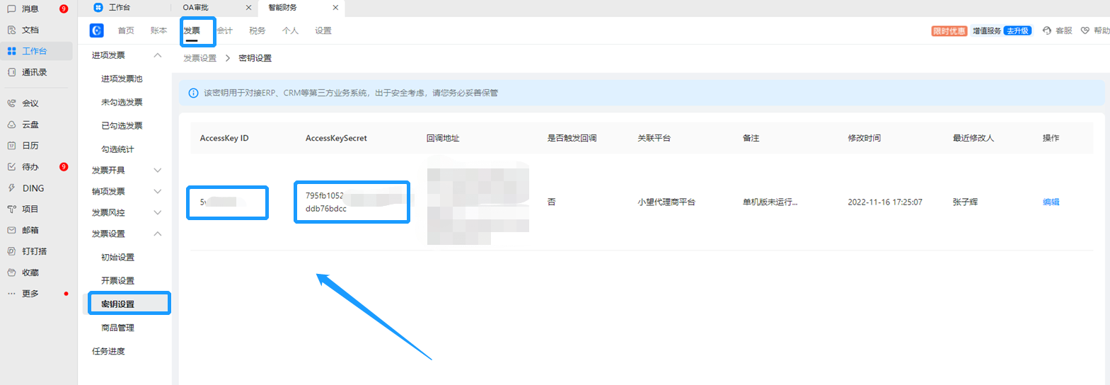 2.点击上方菜单栏“发票”,点击“密钥设置”,将【AccessKey ID】、【AccessKeySecert】两项参数复制,填写到集简云授权账户中