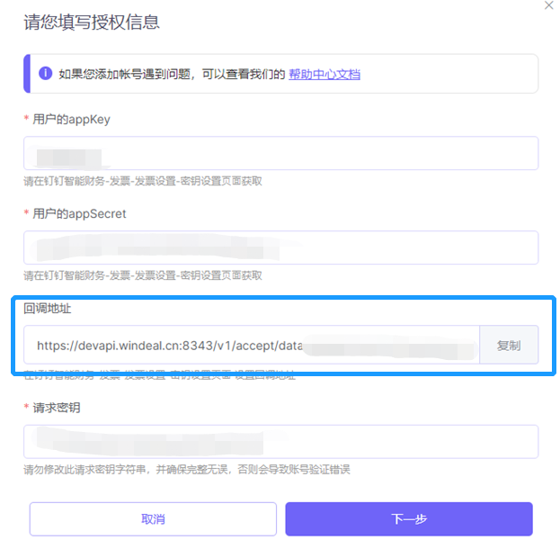 3.在集简云授权页面填写完【用户的appkey】和【用户的appSecert】后,会弹出回调地址,将回调地址复制,回到钉钉页面,点击“编辑”,将回调地址配置到钉钉“回调地址”处,回到集简云授权页面,点击“下一步”即可授权成功