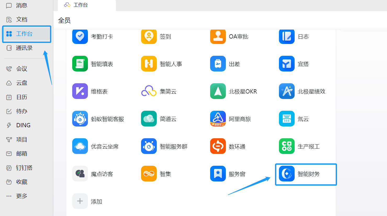 1.首先登录钉钉,点击侧边栏菜单“工作台”,点击“智能财务”