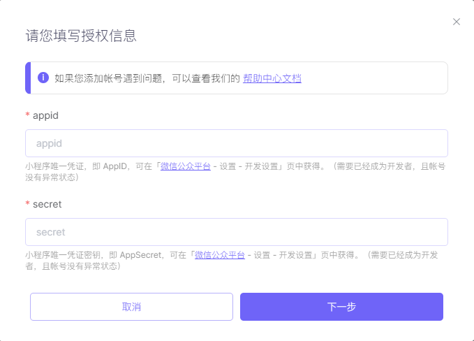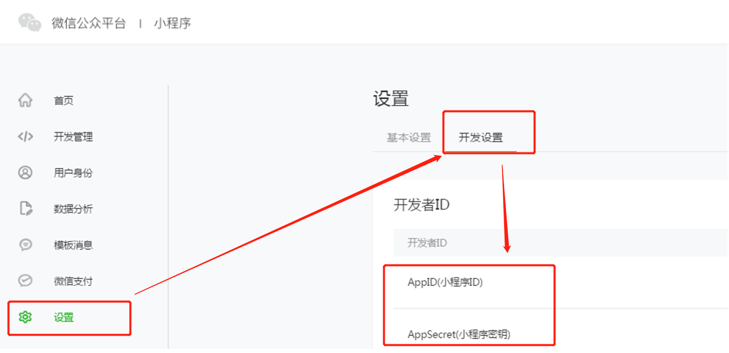 - 左侧边栏设置-开发设置,即可获取到【appid】和【appsecret】2项信息,填入到集简云,点击下一步,即授权成功