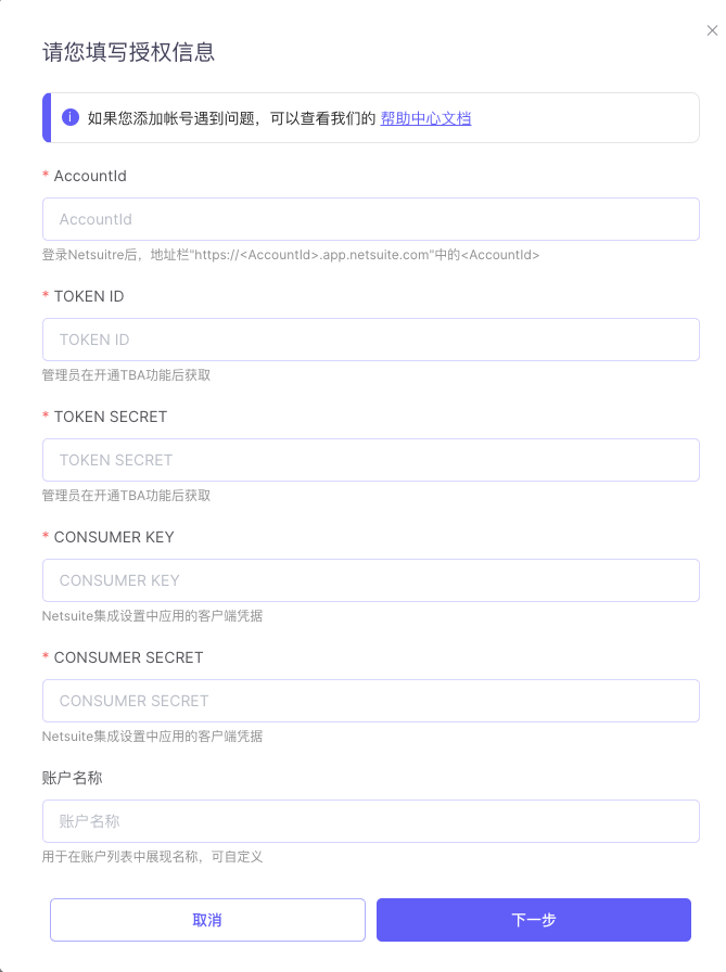 注:【账户名称】字段可自定义,选填,如不填写,则默认显示名称:Oracle Netsuite#1、2、3
